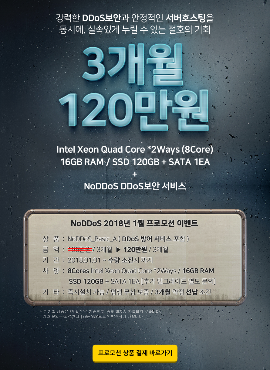 ■ 이벤트 내용 : NoDDoS_Basic (DDoS방어 서비스 포함) 3개월 선납이용시 75만원 즉시할인 = 120만원